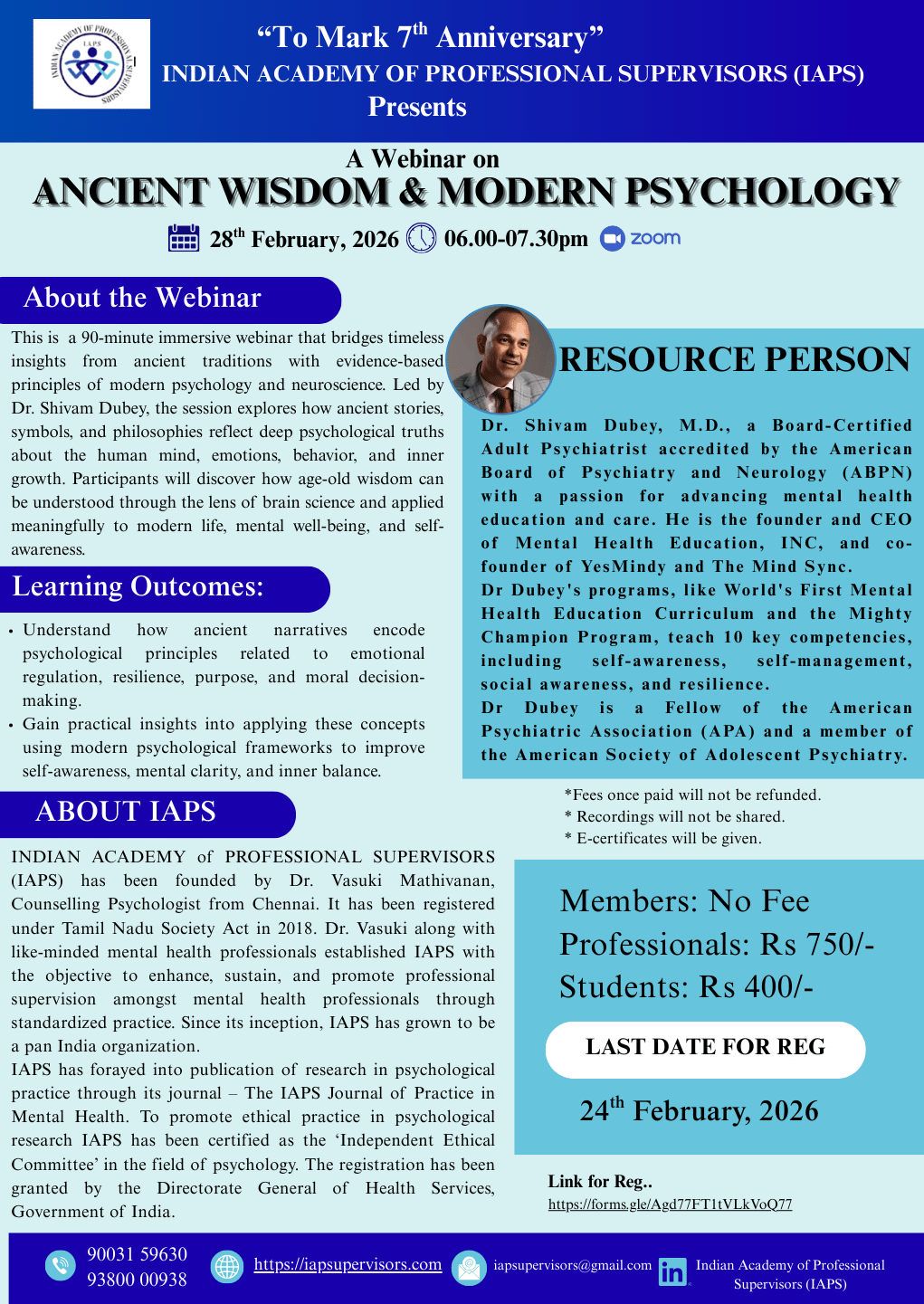 INDIAN ACADEMY of PROFESSIONAL SUPERVISORS (IAPS) has been founded by Dr. Vasuki Mathivanan, Counselling Psychologist from Chennai. It has been registered under Tamil Nadu Society Act in 2018. Dr. Vasuki along with like-minded mental health professionals established IAPS with the objective to enhance, sustain, and promote professional supervision amongst mental health professionals through standardized practice. Since its inception, IAPS has grown to be a pan India organization. Through collaborations with various institutions of repute, IAPS has created awareness about the importance of professional supervision in psychological practice. In compliance with its vision and mission IAPS has expanded its activities into research publication and promoting ethical research protocols.